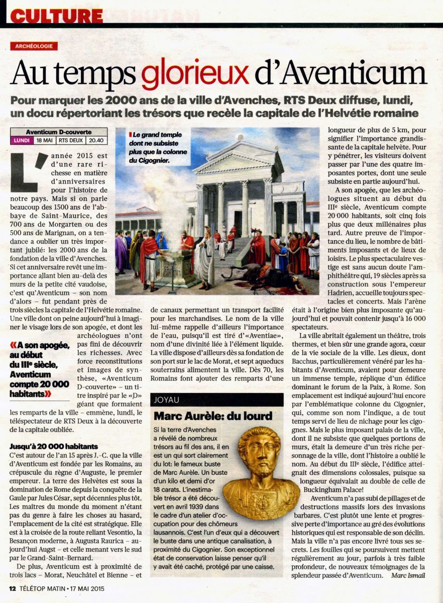 Réalisé par Philippe Nicolet (une coproduction NVP3D - RTS), ce documentaire, notamment diffusé sur TV5 Monde en 2016, présente les grandes découvertes archéologiques faites à Avenches.